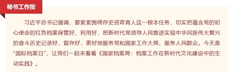 ?檔案是人類活動(dòng)的真實(shí)記錄,是文化傳承的重要載體;檔案工作存史資政育人,是文化建設(shè)的重要力量。國家檔案局深入學(xué)習(xí)貫徹習(xí)近平文化思想,更新理念、創(chuàng)新方法,通過系統(tǒng)謀劃和組織協(xié)調(diào),指導(dǎo)帶動(dòng)各級(jí)檔案部門以多種形式挖掘開發(fā)檔案資源,主動(dòng)融入和服務(wù)新時(shí)代文化發(fā)展繁榮大格局,積極推動(dòng)文化強(qiáng)國建設(shè)。